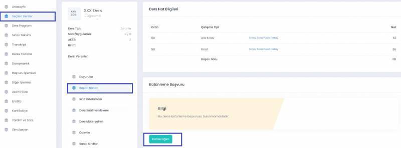 Students who have the right to take the make-up exam and will take the exam must select the relevant course from the "Selected Courses" section in the SABİS-Student Information System and declare that they will "participate" in the make-up exam from the "Success Grades" menu (after their letter success grades are announced). An example reference image is attached.